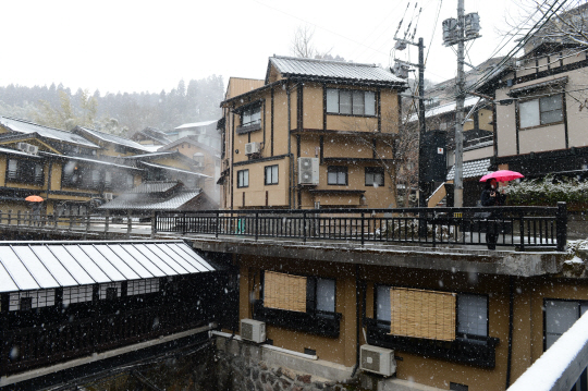 눈 내리는 쿠로가와 마을 풍경.