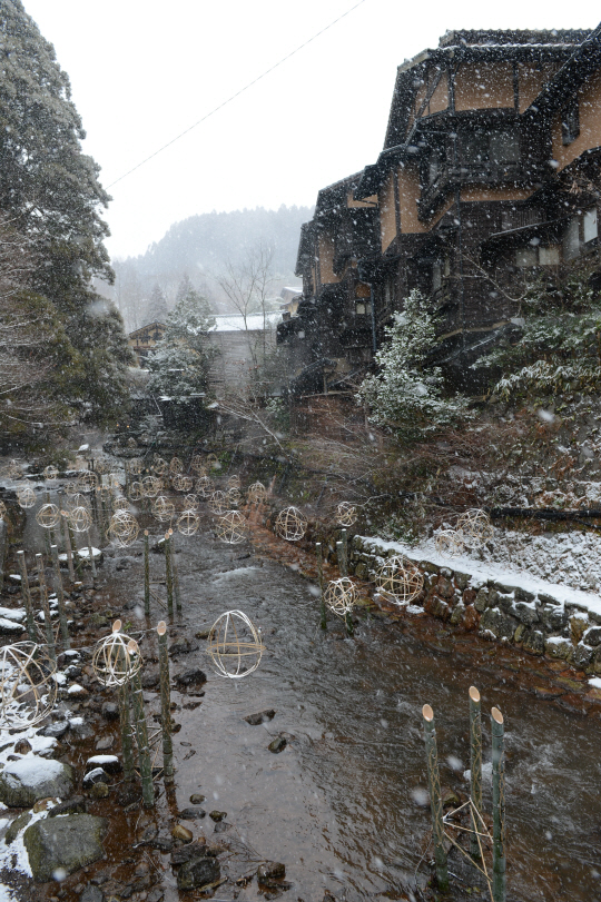 쿠로가와 마을 냇가에 설치된 대나무 조형물이 이색 풍광을 자아낸다.