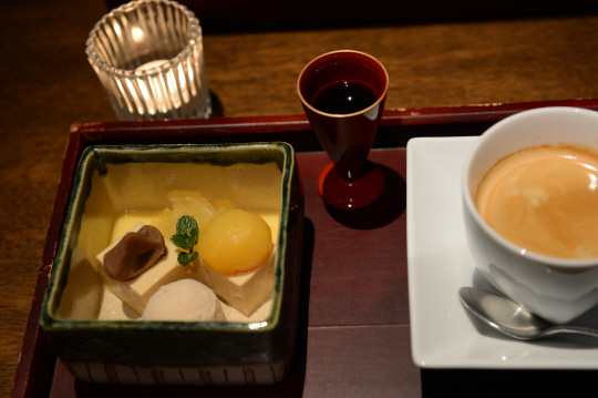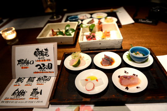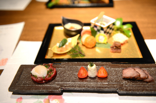 우선 맛깔스럽고 풍성한 가이세키요리는 샴페인 등 식전주로 시작한다. 전체 요리로 아소지역의 말고기회(바사시), 코티지치즈, 게살과 국화잎의 키누타마키(생선 등을 얇은 식재료로 말아낸 요리)가 나온다. 푸아그라와 곶감, 쑥갓 된장과 핫보우소스를 곁들인 연두부, 소송채와 구운 표고버섯 무침, 오리훈제와 사과 꼬치, 아몬드를 묻혀 튀긴 연어전병, 토란줄기의 가다랑어포 무침, 돈부리와 날치 알을 곁들인 가지스프 등 맛나고 진귀한 요리들이 줄을 잇는다. 이후 국요리가 나온다. 무로 만든 떡튀김과 꽃게조각, 완두를 올린 호박스프 등이 그것인데 쫄깃한 떡튀김의 식감이 일품이다. 고등어, 골뱅이, 생새우 등의 카이아소 생선회, 그리고 다진 새우 신비키 튀김, 제철야채튀김 등의 튀김류, 부드러운 달걀에 다양한 재료를 넣어 찐 오보로찜, 두부껍질 백합뿌리찜 등의 찜류, 일품요리로 와규- 능성어 샤브샤브, 흰쌀밥에 개운한 미소된장국 식사 등 10가지의 진귀한 별미가 줄을 잇는다. 이후 밤아이스크림과 무스 사과풍미 등 5가지(택일)의 후식이 순서를 기다린다.