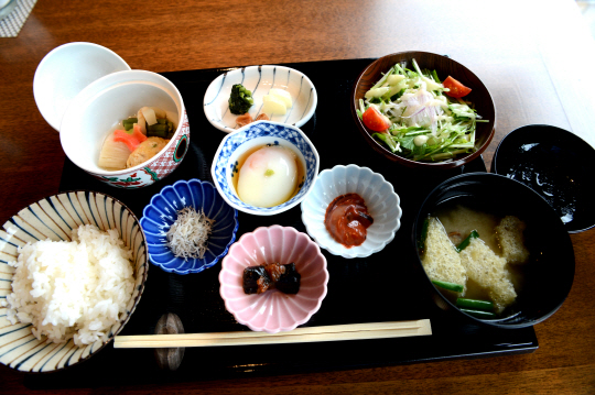 예약한 시간에 먹게 되는 아침 식사도 정갈하지만 풍성하다. 부드러운 비단두부찜, 모로미다시마, 가마아게 멸치, 오징어젓갈, 온천계란, 조림요리, 야채샐러드, 오늘의 건어물(마른 생선구이), 쌀밥에 보리된장국, 야채절임, 과일, 그리고 황금색 젓소우유(5가지의 음료 중 하나를 고른다) 등 한상 가득이다.