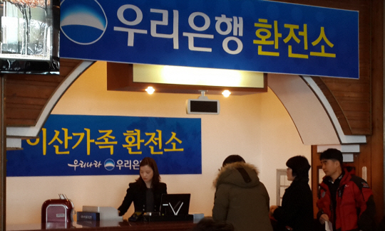 우리은행은 2004년 12월 국내은행 가운데 유일하게 개성공단에 지점을 설치하여 운영하고 있으며, 개성공단에 출입경하는 기업 임직원을 위해 남북출입사무소에 도라산 환전소도 운영하고 있다.