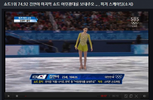 '피겨여왕' 김연아의 쇼트 경기가 N스크린 서비스 '티빙'에서 중계한 역대 2014년 소치 동계올림픽 경기 중 최고 시청률(이용자 점유율)을 기록했다고 CJ헬로비전측이 밝혔다.