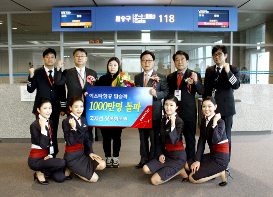 이스타항공(대표 박수전)이 누적 탑승객 1000만명을 돌파했다. 이스타항공에 따르면 2009년 1월 7일 김포-제주 첫 취항 후 5년 1개월(1870일) 만에 인천-홍콩 노선 탑승고객 중 1000만번째 탑승 고객이 나왔다.