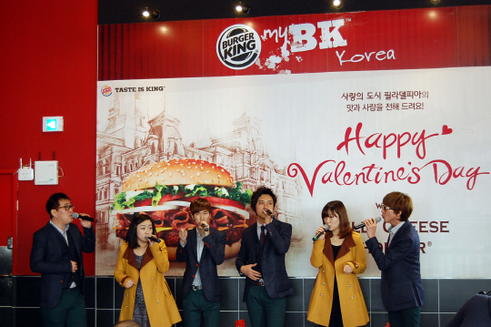 버거킹은 지난 발렌타인데이를 맞이해 젊은 세대들을 위해 '필리 러브 깜짝 콘서트'를 개최했다. 버거킹 선릉역점과 강남대로점에서 혼성 6인조 아카펠라 그룹의 공연과 추억 만들기 이벤트를 선사했다.