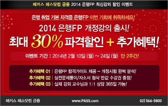 해커스패스닷컴 금융이 2014 은행 FP 강의 할인 이벤트를 한다. 사진제공=해커스패스닷컴 금융