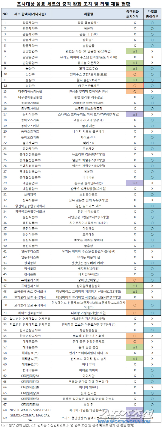 이밖에 롯데칠성음료('비타파워' 등 5개 제품), 웅진식품('아침햇살' 등 6개), 광동제약('진홍삼골드' 등 5개), 동아오츠카('겨울나기' 등 4개 제품), 정식품('베지밀' 등 3개) 등이 판매하는 음료 제품들은 충격완화 조치를 전혀 하지 않는 등 파손 위험에 부실한 것으로 나타났다.