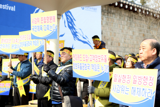 ◇사행산업통합감독위원회의 사행산업 건전발전 종합계획 관련 공청회가 열린 지난 13일 국립민속박물관 앞에서 공공레저산업노동조합연대 관계자 등이 사감위 전자카드 전면 도입 정책에 반대하며 항의하고 있다.