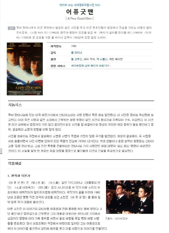 '영화 작품 사전'은 네이버와 씨네21(대표이사 김상윤)이 작년 7월 고품질 영화 전문 정보 구축을 위해 체결한 전략적 제휴의 첫 결과물로 국내 최초의 영화 작품 사전이다. 이번에 선정된 작품은 500편으로 '역사적 사실을 바탕으로 한 영화', '법정 영화' 등 35개 테마로 구성됐다. 벤허, 스파르타쿠스, 바람과 함께 사라지다, 트루먼쇼 등 85편의 영화가 이번에 1차로 공개됐다.