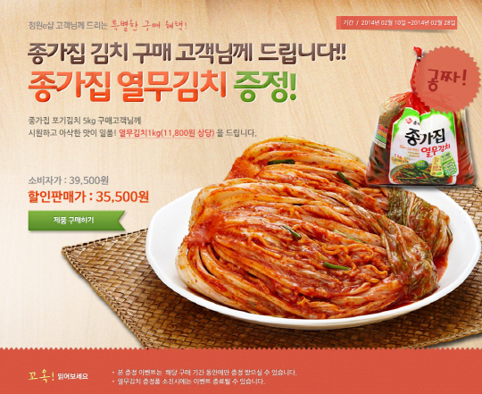 대상FNF 종가집이 정원e샵(www.jungoneshop.com)과 함께 '종가집 열무김치 증정' 행사를 오는 28일까지 진행한다.