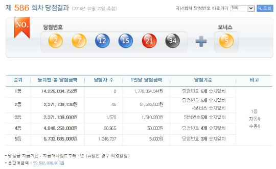 22일 제586회차 로또복권을 추첨한 결과, 1등에 당첨된 사람은 총 8명으로 각 17억7800만원씩 받게됐다.