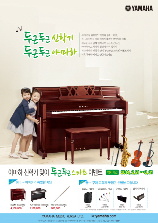 피아노악기전문기업 야마하뮤직코리아㈜ (대표: 야마다 토시카즈)는 새학년 새학기를 맞이해 자사의 일부 인기 모델을 특별가에 판매하고, 푸짐한 사은품을 증정하는 '두근두근 스타트 이벤트'를 실시한다고 24일 밝혔다.