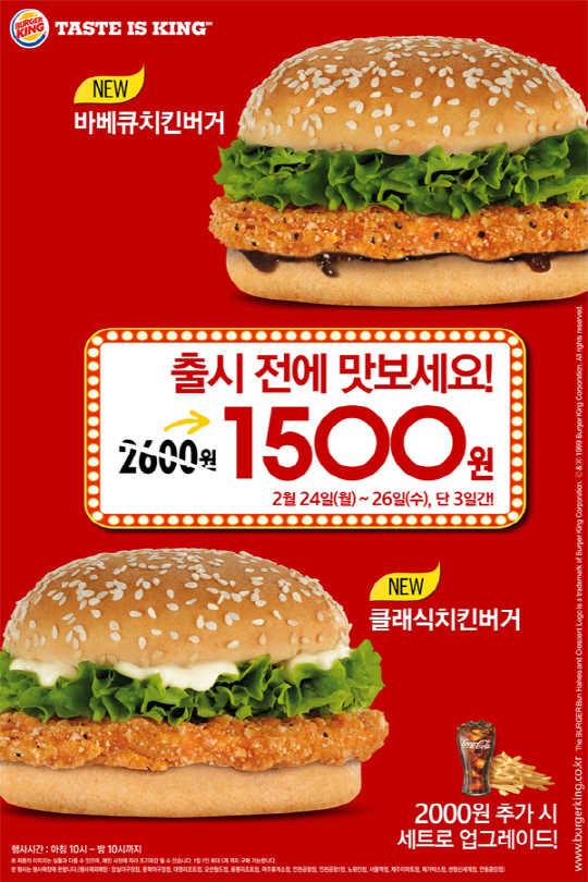 버거킹이 24일부터 26일까지 3일간 신메뉴 '치킨버거' 2종을 한정 판매한다.