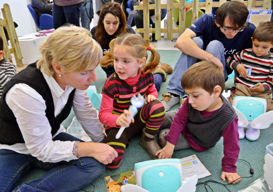 | 바로셀로나에 위치한 스페인 1위 통신사 텔레포니카 모바일 월드 센터에서 직원들이 스마트폰을 활용한 교육 로봇'아띠'를 이용해 아이들에게 놀이 교육을 시키고 있다. SK텔레콤은 '아띠'를 비롯한 앱세서리(앱과 연동해 스마트 기기의 기능을 확장 시키는 주변기기) 를 바로셀로나에서 열리는 모바일월드콩그레스 2014(2.24~27)에서 선보인다. <사진출처 MWC 사진공동취재단 > |