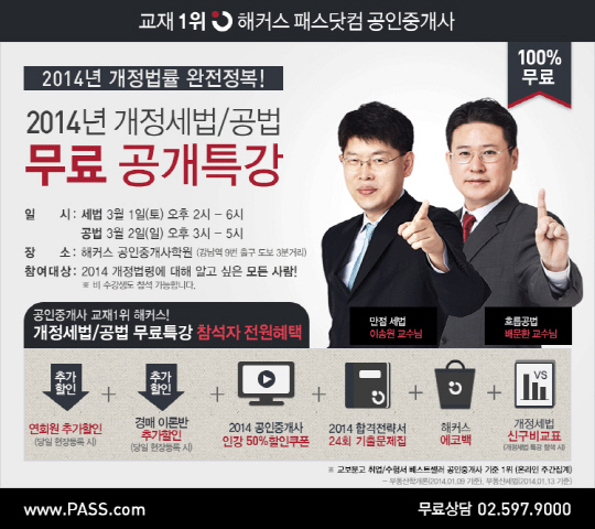 2014년 새롭게 개정된 세법과 공법에 대해 빠르고 쉽게 학습할 수 있는 방법이 공개 될 '2014년 개정 세법-공법 무료 공개 특강'은 다음달 1일 오후 2시, 2일 오후 3시 강남역에 위치한 해커스 패스닷컴 공인중개사학원에서 진행된다.