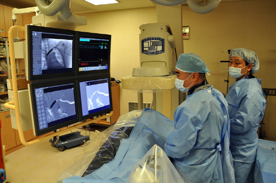 ◇가톨릭대학교 서울성모병원 영상의학과 천호종 교수가 혈관(동정맥루)가 막힌 혈액투석환자를 영상의학 중재시술로 치료하고 있다.