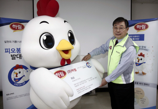 닭고기 전문 기업 하림이 24일 전북 익산 하림본사에서 야생동물 보호와 자연보호 활동을 하기 위한 임직원 50여명이 동물복지 피오봉사단 발대식을 진행했다. 하림 브랜드 프레쉬업 마스코트 피오에게 이문용 하림 대표이사가(오른쪽) 봉사단 부단장 위촉을 하고 있다. 사진제공=하림 |