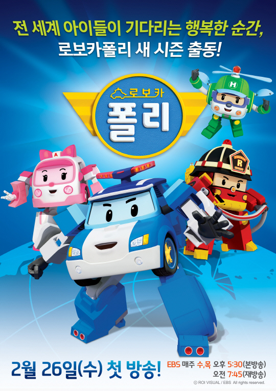 '로보카 폴리'의 새 시즌은 EBS에서 26일부터 매주 수, 목요일 오후 5시 30분 방송된다. 이번 시즌은 세계적인 인기에 맞춰 업그레이드된 블록버스터급 재미를 선사할 예정이다. EBS와 국내 애니메이션 제작사 로이비쥬얼이 공동제작한 '로보카 폴리'는 어린이들에게 이해, 배려, 협력 등 건강한 인성발달을 돕는 주제를 재미있게 전달하는 인기 애니메이션이다. 브룸스 타운의 멋진 구조대 경찰차 '폴리'와 소방차 '로이', 앰뷸런스 '앰버', 헬리콥터 '헬리', 오퍼레이터 소녀 '진'이 매회 위험에 빠진 어린이 친구들을 구조하는 과정을 흥미진진하게 그린다.
