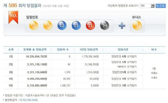 로또 586회 당첨자는 총 8명으로 4명이 서울(금천구, 중구, 송파구, 도봉구)이며 경기도(고양시, 수원시) 2명, 경북 경주, 부산 금정구에서 각각 1명씩 나왔다. 1등 당첨자는 각각 17억7835만4344원을 받게 된다.