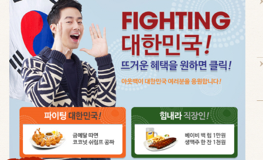 첫째는 한국 선수들이 금메달을 획득하면 그 다음날 오전 10시부터 오후 10시 사이에 홈페이지에서 쿠폰을 출력하고 당일 방문하면 인기 애피타이저 메뉴인 골드 코스트 코코넛 쉬림프를 무료를 증정하는 것. 둘째는 가족을 위한 이벤트로 13세 이하 어린이를 동반한 가족에 한해 3만원 이상 주문시 아웃백 키즈 메뉴를 1000원에 제공한다.
