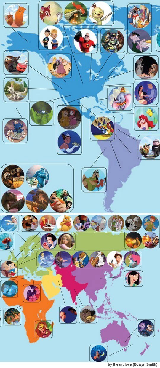 이 지도에 따르면 위니더푸와 로빈후드의 고향은 영국 잉글랜드이다. '101 달마시안'도 역시 잉글랜드가 배경이다. '미녀와 야수'는 프랑스가 배경이고, '헤라클레스'는 그리스로 표시됐다.