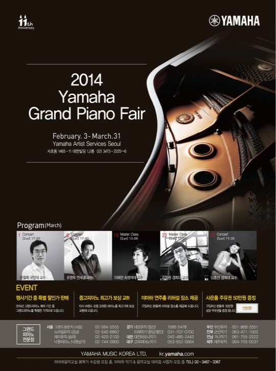 한편 '야마하 그랜드피아노 페어'는 3월 31일까지 야마하아티스트서비스서울과 전국 야마하 그랜드피아노 전문대리점에서 진행된다. 행사 기간 중 야마하는 그랜드피아노 전 모델을 특별가에 판매하고, 그랜드피아노 구매 고객에게 50만원 상당의 주유권을 증정할 예정이다. 또한 타사 브랜드를 포함한 중고 피아노를 최고가로 보상해주는 보상판매 이벤트도 함께 실시한다.