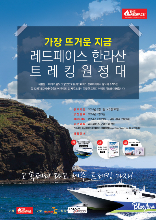 '레드페이스 한라산 트레킹 원정'은 4월 24일부터 26일까지 2박 3일 동안 진행되며, 제주행 고속페리 탑승권을 비롯한 교통비와 숙박 등 제주도 여행 경비 일체를 지원한다. 응모는 전국 레드페이스 매장에서 상품 구매 후 수령한 응모권의 인증번호를 이벤트 페이지에 접속해 입력하면 된다. 입력 시 상품 구매 후기와 응모 사연을 작성하면 당첨확률이 높아진다. 당첨자 발표는 4월 3일 레드페이스 홈페이지 (www.theredface.com)에서 확인할 수 있다.