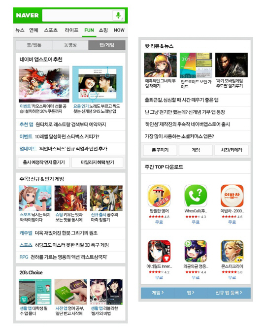 네이버 모바일 메인 페이지에 앱/게임판을 신설해 이용자와 중소 앱 개발사간 접점을 확대한다. 앱/게임판의 우수앱 추천 코너, 양질의 리뷰 등을 통해 다양한 앱을 이용자에게 간편하게 소개할 예정이다.