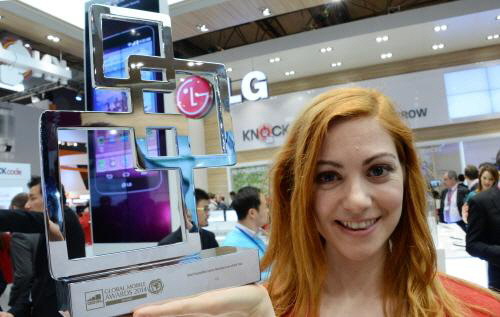 ◇스페인 바르셀로나에서 열리는 'MWC 2014'에서 '가장 혁신적인 제조사'에 선정되는 영예를 안았다. 이 LG전자 모델이 LG전자 부스에서 트로피를 들고 포즈를 취하고 있다.