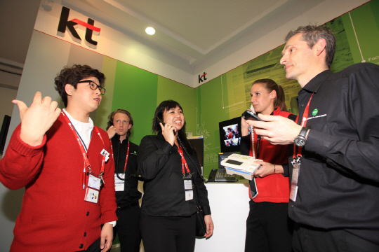 | ◇KT는 화상회의 통합 플랫폼인 KTCX(Collabo-eXchanger)를 개발 완료, 상용화 준비 중에 있다고 26일 발표했다. 스페인 MWC2014 현장에서 이기종 화상회의 시스템을 시연해 보이고 있다. |
