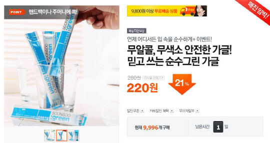 특히 올해는 커피믹스처럼 생긴 휴대용 구강 청결제가 인기다. 26일 현재 1만개가 매진되며 실내에서 뿐 아니라 야외활동이나 이동 중에도 수시로 구강 청결제를 이용해 입안을 소독하려는 사람들이 많은 것으로 보인다.