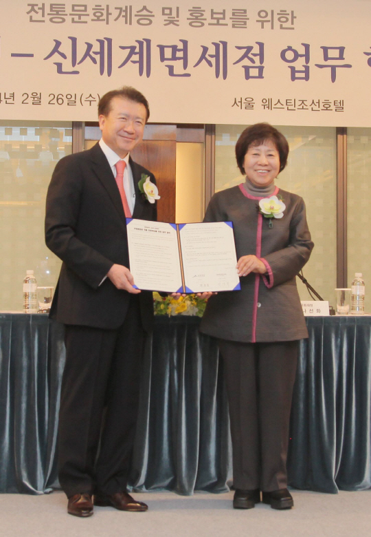 신세계면세점과 문화재청은 26일 오전 조선호텔 오키드룸에서 전통문화 계승 및 홍보를 위한 '무형문화재 지정판매' 협약식을 가졌다.