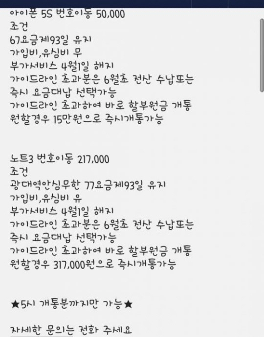 또 다른 게시판에는 "KT 번호이동 아이폰5S 3만원, 갤럭시S4 12만원, 77 부유 가유 유유"라는 게시글이 올라와 핸드폰을 사려는 이들의 관심을 집중시켰다.