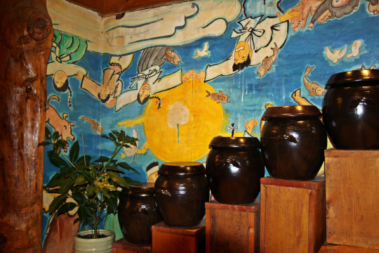 양념갈비를 육장에 찍어 먹으면 너무 달지 않아 뒷맛이 개운하며 부드럽다. 산야초 효소를 담은 항아리는 매장의 전통적 분위기를 살리는 인테리어로도 쓰이고 있다.