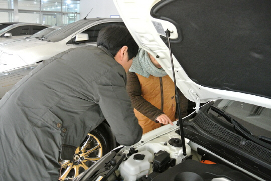 그 후 차 보닛을 열어 보닛 사이드에 있는 볼트에 풀었던 흔적이 있는지, 보닛 끝 실리콘 경도 등을 확인한다. 차를 수리할 때 조여진 볼트는 반드시 풀어야 하기 때문에 그 흔적이 남는다. 볼트는 차 외관과 같은 색깔로 도색돼 있는데 볼트가 다른 색깔이거나 도색이 벗겨져 있는 것은 수리한 흔적이다. 또한 보닛 끝 실리콘도 수리 후 다시 칠했을 경우 손톱으로 눌러보면 물렁하다. 엔진을 볼 때는 엔진룸 주위로 오일이 샜던 흔적이 있는 지 유심히 봐야 한다.