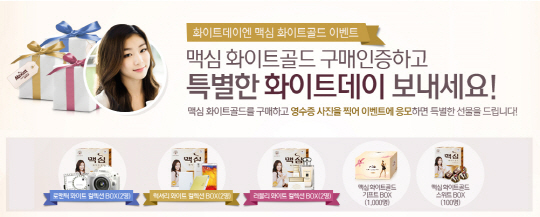 로맨틱 박스는 화이트 컬러의 DSLR 카메라와 액자, 맥심 화이트골드 제품이, 럭셔리 박스는 화이트골드 컬러의 휴대폰과 프린터, 맥심 화이트골드 제품으로 구성됐으며 러블리 박스는 화이트컬렉션 화장품 및 향수, 맥심 화이트골드 제품이 포함됐다.