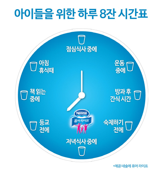 수분이 부족한 상태로 학교에 등교하는 것을 방지 하기 위해, 일어나자 마자 아이에게 물을 권해 보자. 또한 아침식탁에도 물 한잔을 놓아 마시게 해 수분이 충분히 공급된 상태로 등교를 할 수 있도록 해아 한다. 또 등교 전 아이들의 가방 속에 물 한 병을 넣어 주며 학교에서도 충분히 수분을 섭취해야 한다는 것을 알려주자. 아이들은 탄산 음료나 과일 음료를 마시는데 익숙하여 하루 8잔의 물을 마시는데 어려움을 느낄 수 있다. 이에 '점심 먹은 이후' 또는 '숙제 하는 동안' 처럼 하루 8번 물을 마시는 시간을 정해주면 보다 손쉽게 아이들의 수분 섭취 습관을 형성할 수 있다. 풀무원샘물의 '네슬레 퓨어 라이프'는 550가지 수질검사를 실시하는 등 철저한 관리를 통해 아이들이 언제나 안심하고 마실 수 있는 물을 제공한다. 또한 특유의 담백함과 부드러운 목 넘김으로 물맛이 좋아 하루 8잔의 물을 꾸준히 섭취하는 습관을 들이는데 적절하다. 전상희 기자 nowater@sportschosun.com