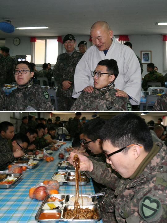 정우스님은 지난 30사단 신병교육대 훈련병 및 수색대대 장병 1200명과 26사단 신병교육대 800명에게 자장면과 과일을 보시해 자장면 배식 봉사활동을 직접 펼치며 장병들을 격려했다. 지금까지 군부대를 방문해 3천여 명의 군인들에게 자장면 보시행을 이어온 스님은 '앞으로 군부대 자장면 보시운동을 지역별로 확대해 지역경제에도 기여한다'는 포부를 가지고 있다. 또한 전방 30개 부대에 핫팩 22만개 등 겨울위문품을 지원하는 등 전방부대 물품기증을 통해 국군장병 사기진작에 크게 기여했다.