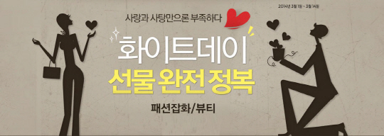 한편, 옥션에서는 14일까지 '화이트데이 선물 완전정복 프로모션'을 진행한다. 츄파춥스 미니튜브 50개 (7900원), 애미어스유기농사탕 1통(1만3900원), 롯데 롤리팝 70개(7900원) 등의 사탕 선물이 준비됐다.