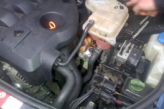 약 20km를 주행한 자동차 엔진룸에서 강아지가 발견돼 무사히 구출됐다.