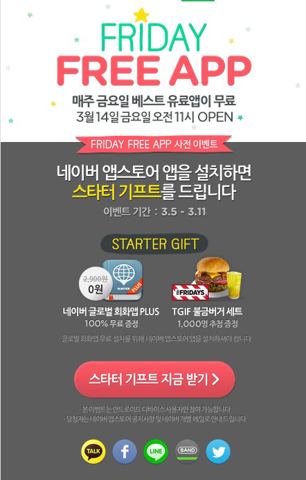 네이버㈜(대표 이사 사장 김상헌)는 네이버 앱스토어에서 엄선한 인기 유료 애플리케이션(이하 앱)을 매주 금요일 오전 11시부터 24시간 동안 무료로 다운로드 받을 수 있는 '프라이데이 프리앱' 이벤트를 오는 14일부터 상시적으로 진행한다고 밝혔다.