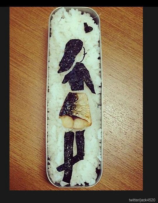공개된 사진 속에는 밥 위의 반찬들이 여성의 모습으로 장식되어 있어 보는 이들의 이목을 집중시킨다.
