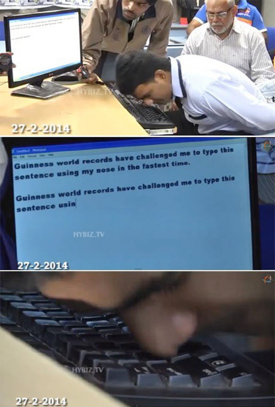 하루 6시간의 '코 타이핑' 맹훈련을 통해 세계 기록을 세운 인도 남성은 종전 사우디아라비아 남자가 세운 기록을 월등이 앞섰다. 사우디아라비아 남자가 세운 1분 33초를 단 47초로 단축시켰다.