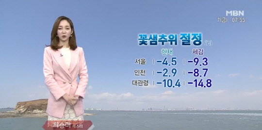 특히 서울은 영하4.5도 대관령은 영하 10.4도까지 떨어졌으며, 강한 바람 때문에 체감온도는 서울이 영하 9.3도, 대관령 영하 14도 등으로 대부분 영하 10도 떨어지며 꽃샘추위가 절정을 보이고 있다.