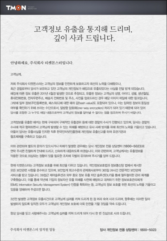 이에 티몬 사과문을 발표하고 공식 사과했다. 티몬측은 "고객정보를 유출한 해커는 현재 구속돼 구체적은 유출 경위 등에 대한 경찰의 수사가 진행되고 있으며 당사는 경찰의 수사에 적극 협력하면서 고객님께 발생할 수 있는 피해를 예방하고 유사 사례 방지를 위해 최선의 노력을 기울이고 있다"고 전했다.