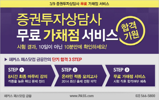 또한 해커스 패스닷컴 금융은 9일 증권투자상담사 시험 직후 무료 가채점 서비스를 제공한다. 시험결과를 합격자 발표일까지 기다릴 필요 없이 답안을 입력하면 즉시 자신의 시험 점수를 확인할 수 있다. 전 과목뿐만 아니라 과목별로도 채점 서비스를 제공하며, 9일 오후 12시 증권투자상담사 시험 직후부터 해커스 금융 (www.PASS.com) 사이트에서 해커스 금융 회원이라면 누구나 이용 가능하다.