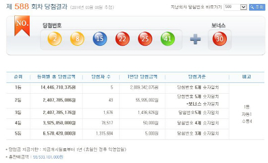당첨번호 4개를 맞힌 4등은 7만8517명으로 고정 당첨금 5만원, 당첨번호 3개가 일치한 5등은 131만5684명으로 5000원씩 받게된다.