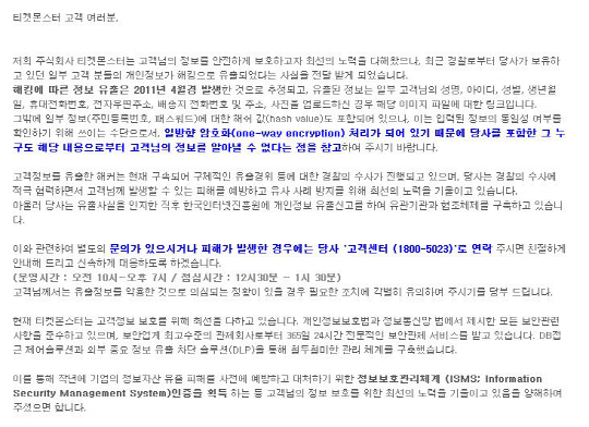 티몬측은 '고객님의 정보를 안전하게 보호하고자 최선의 노력을 다해왔으나, 최근 경찰로부터 당사가 보유하고 있던 일부 고객 분들의 개인정보가 해킹으로 유출되었다는 사실을 전달 받게 되었습니다. 해킹에 따른 정보 유출은 2011년 4월경 발생한 것으로 추정되고, 유출된 정보는 일부 고객님의 성명, 아이디, 성별, 생년월일, 휴대전화번호, 전자우편주소, 배송지 전화번호 및 주소, 사진을 업로드하신 경우 해당 이미지 파일에 대한 링크입니다. 그밖에 일부 정보(주민등록번호, 패스워드)에 대한 해쉬 값(hash value)도 포함되어 있으나, 이는 입력된 정보의 동일성 여부를 확인하기 위해 쓰이는 수단으로서, 일방향 암호화(one-way encryption) 처리가 되어 있기 때문에 당사를 포함한 그 누구도 해당 내용으로부터 고객님의 정보를 알아낼 수 없다는 점을 참고하여 주시기 바랍니다' 등의 글을 게시했다. 또한 '피해를 예방하고 유사 사례 방지를 위해 최선의 노력을 기울이고 있습니다'라고 밝혔다.
