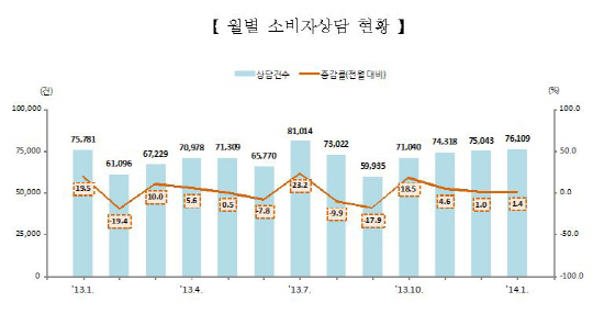 품질 불만족 등 '물품'에 관한 상담은 4만1756건으로 전월 대비 2.3% 증가했고, 서비스에 대한 불만 상담은 4.6% 증가한 2만9947건을 기록했다.