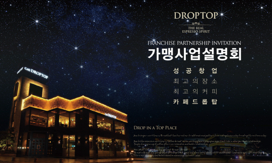 프랜차이즈 커피전문점 드롭탑이 오는 12일부터 5주 동안 서울을 시작으로 전국의 주요 도시를 순회하며 가맹 사업설명회를 개최한다.