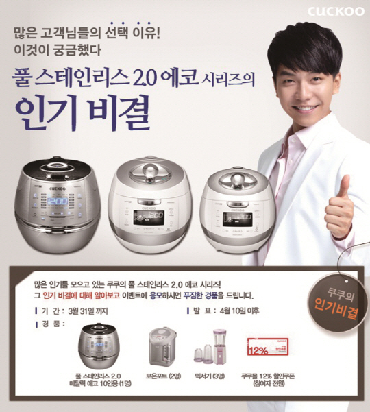 건강생활가전기업 쿠쿠전자(대표 구본학, www.cuckoo.co.kr)가 프리미엄 밥솥 '풀스테인리스 2.0 에코 시리즈'의 고객성원에 보답하기 위한 이벤트를 실시한다.